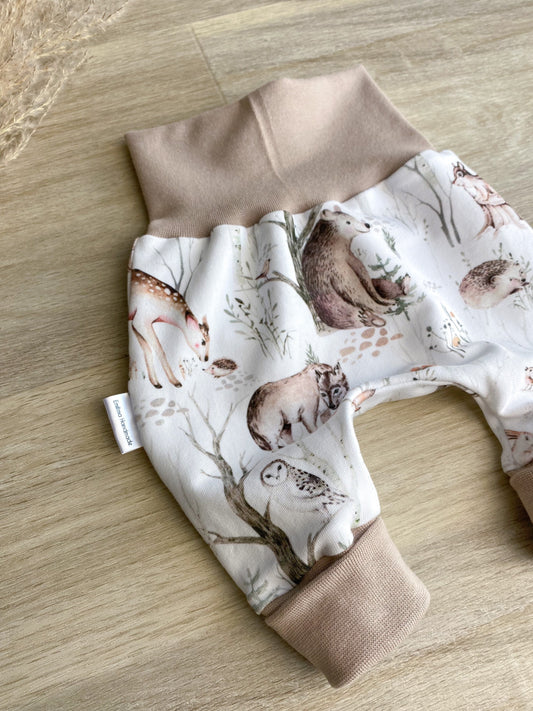 Pumphose Babyhose Baggypants Birkenwald Waldtiere Weiß Kiesel Newborn