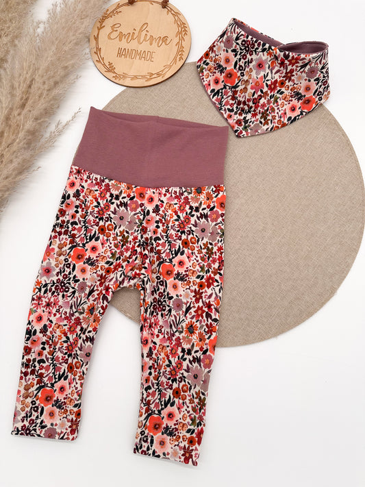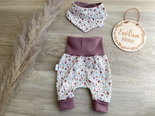 Set Pumphose Baby Jersey Halstuch kleine Blumen Mädchen Weiß dunkles altrosa