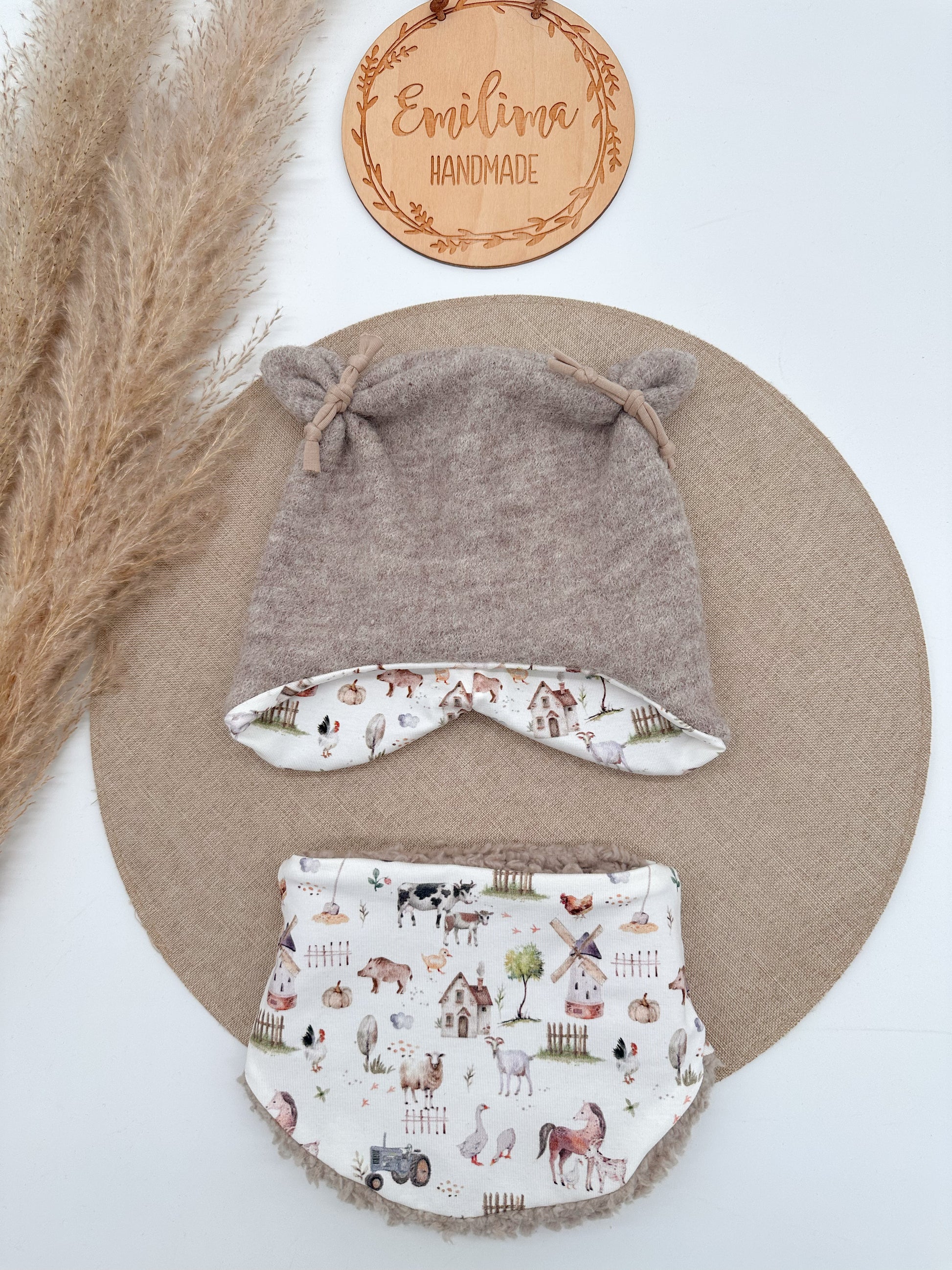 Set aus Öhrchenmütze und Halssocke aus Walk / Jersey , gefüttert mit Teddyfleece/ Jersey.